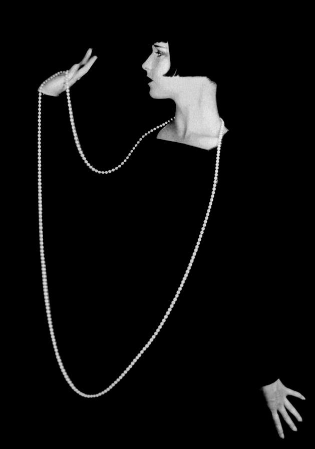 1929: American actress Louise Brooks (1906 – 1985) wearing a long necklace which stands out starkly against a black background. (Photo by Eugene Robert Richee)